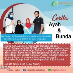 Saya mengucapkan ribuan terimakasih kepada DR.dr.Zulmaeta,Sp.OG.(KFM) yang sudah menyelamatkan nyawa istri dan anak saya.Disaat istri saya pendarahan dan sempat henti nafas dan dengan pertolongan Allah dan kesigapan Dokter yang luar biasa. Alhamdulillah hari ini kami sudah diizinkan untuk pulang kerumah. Terimakasih juga buat perawat-perawat RSIA Andini