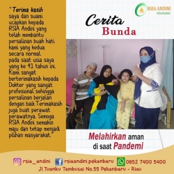 Terima kasih saya dan suami ucapkan kepada RSIA Andini yang telah membantu persalinan buah hati kami yang kedua secara normal pada saatmusia saya yang ke 41 tahun ini. Kami sangat berterimakasih kepada Dokter yang sangat profesional sehingga persalinan berjalan dengan baik.Terimakasih juga buat perawat -perawatnya. Semoga RSIA Andini semakin maju dan tetap menjadi pilihan masyarakat